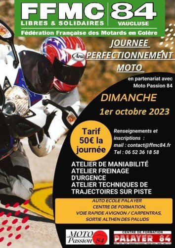 En partenariat avec Moto-Passion 84 et l’école de conduite PALAYER, avec le soutien du Plan départemental d’actions de sécurité routière (PDASR) de la préfecture de Vaucluse, la FFMC 84 organise
