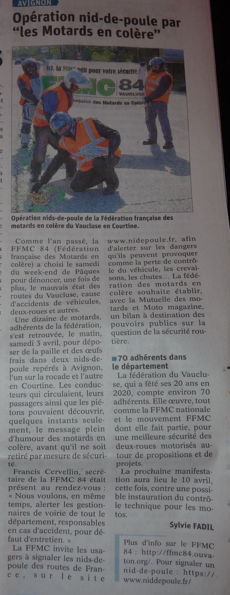 C’est par grand vent mais sous un beau soleil que quelques militants de la FFMC 84, accompagnés de journalistes et de policiers, ont fêté Pâques en allant décorer des nids de poule sur la rocade d’Avignon qui n’en manque pas (alors même qu’elle a été refaite en partie récemment suite aux travaux du tramway).